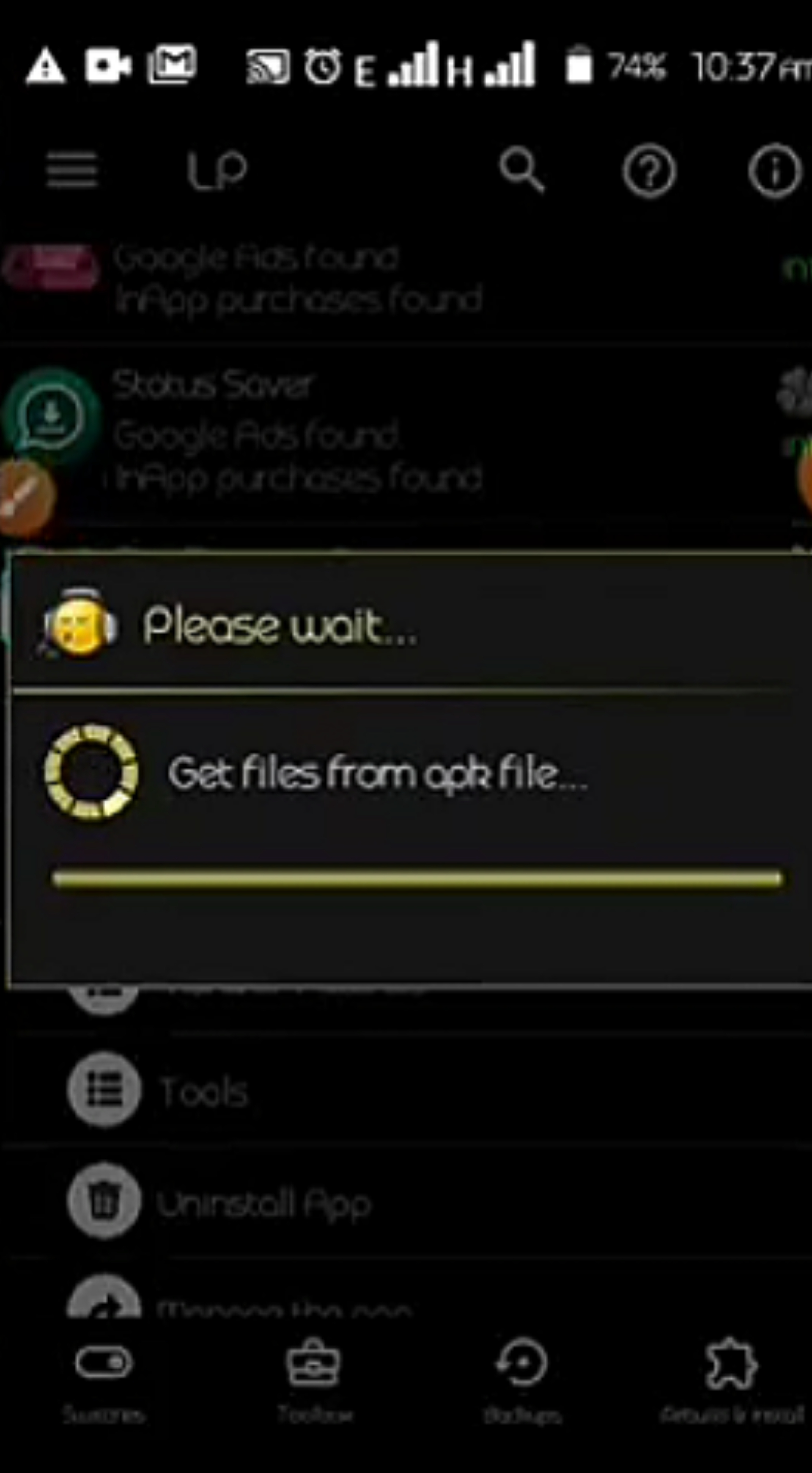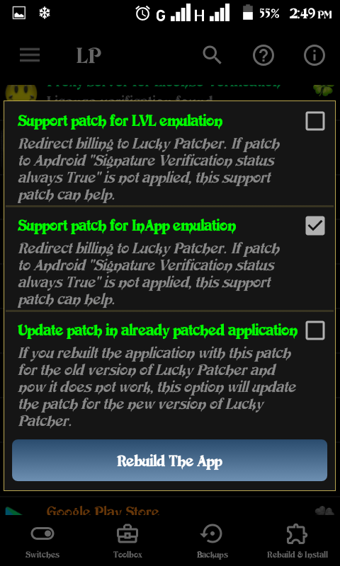 Select menu of patches and click on modified APK file, a new menu will pop-up, select APK rebuilt for InApp and LVL emulation.